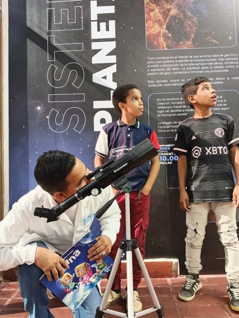 La experiencia superó los límites del papel. Tras la sesión narrativa, los jóvenes tuvieron la oportunidad de interactuar con telescopios profesionales, observar representaciones detalladas del sistema solar y conectar los conceptos teóricos con la observación práctica.