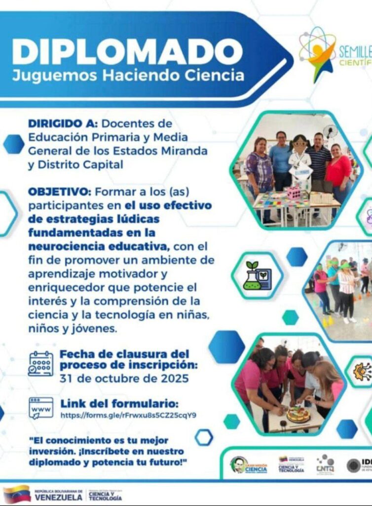 (Caracas, 9 de octubre de 2025).- El Ministerio del Poder Popular para Ciencia y Tecnología (Mincyt) abrió la inscripción para el diplomado Juguemos Haciendo Ciencia, dirigido a docentes de educación primaria y media general de los estados Miranda y Distrito Capital.