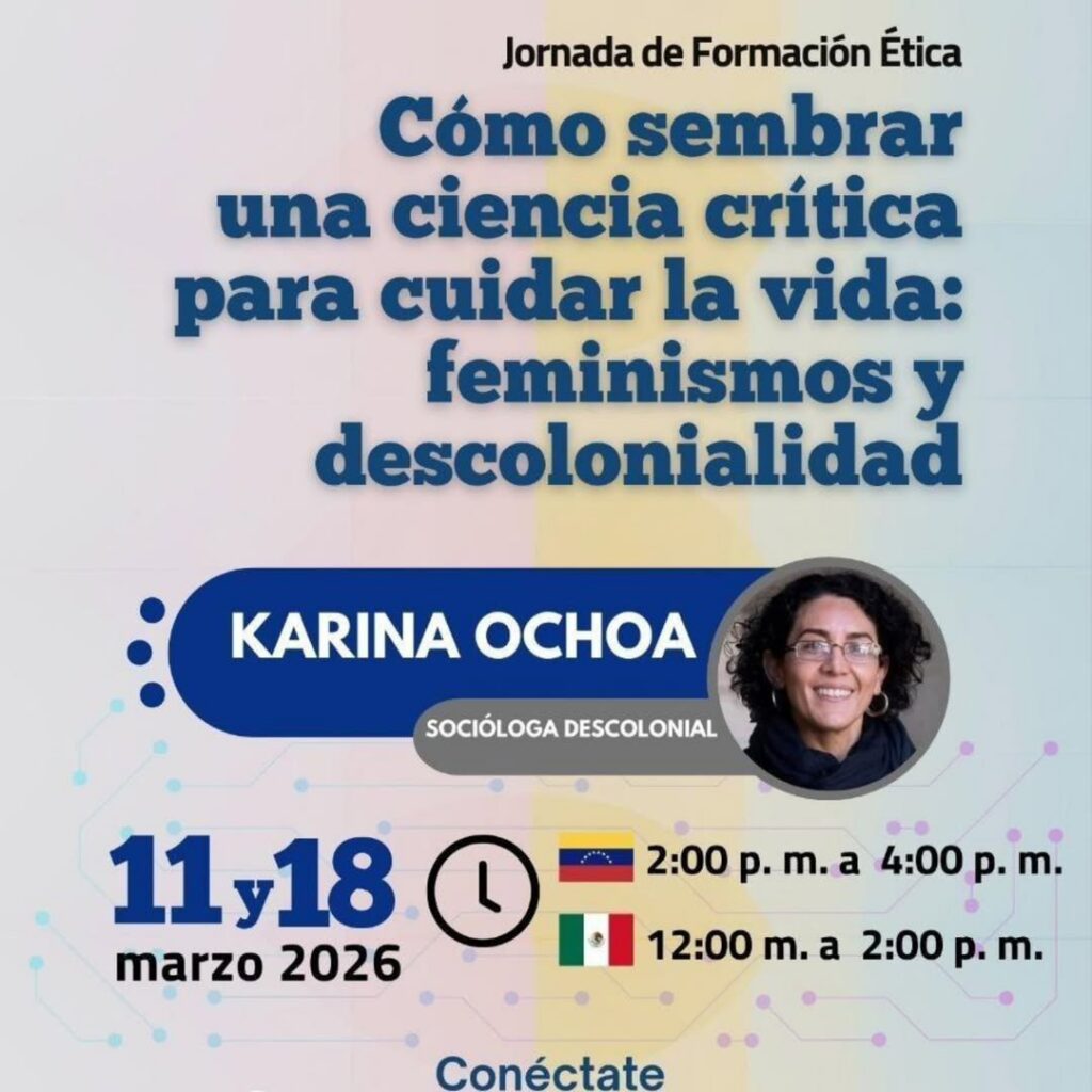 El encuentro se desarrollará los días 11 y 18 de marzo a las dos de la tarde (hora de Venezuela), en el marco de la Jornada de Formación Ética titulada Cómo sembrar una ciencia crítica para cuidar la vida: feminismos y descolonialidad.