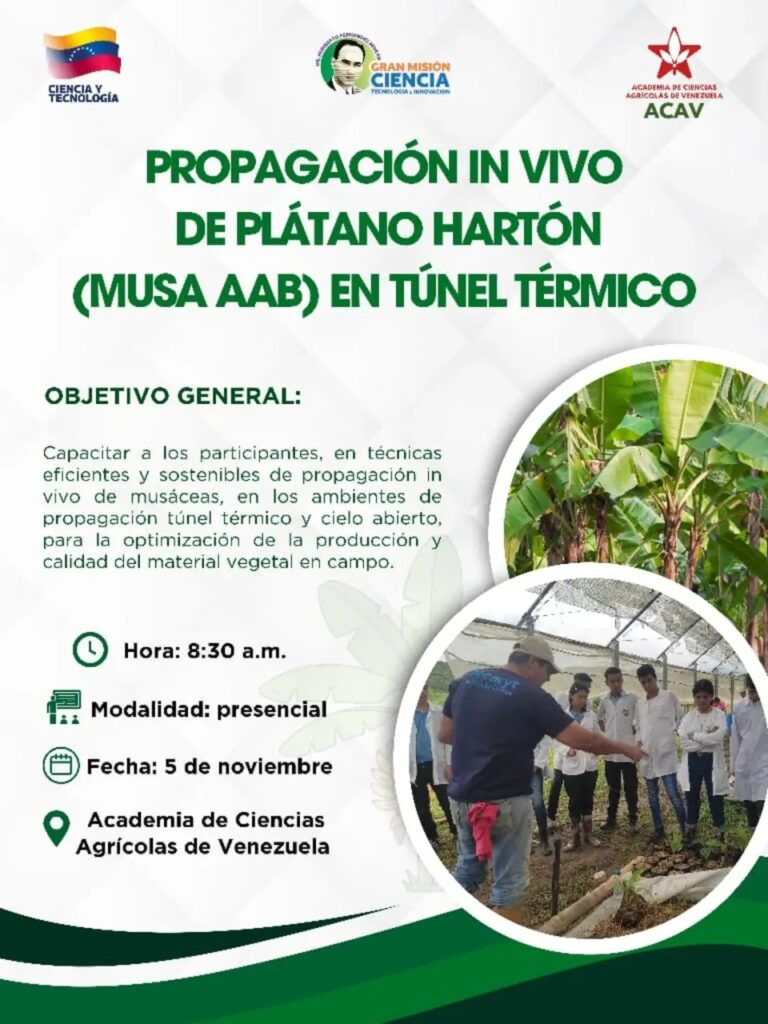 (Caracas, 4 de noviembre de 2025). – El Ministerio del Poder Popular para Ciencia y Tecnología (Mincyt), a través de la Academia de Ciencias Agrícolas de Venezuela (ACAV), realizará un taller para la optimización de la producción agrícola nacional denominado Propagación In Vitro de Plátano Hartón (Musa AAB) en Túnel Térmico.