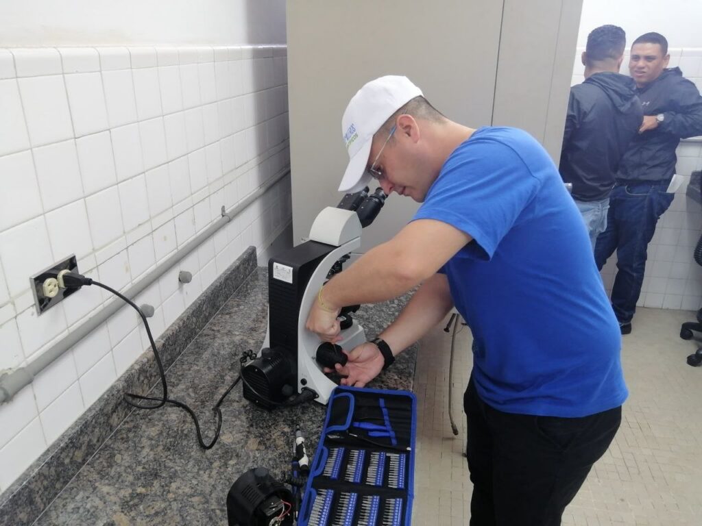 En esta etapa inicial, los técnicos de Cayapa Heroica lograron la recuperación de microscopios esenciales para el laboratorio, realizando labores de mantenimiento profundo de objetivos ópticos y calibración de precisión en tornillos micrométricos y macrométricos.