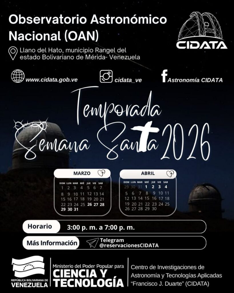 (Caracas, 2 de abril de 2026).- En el marco del asueto de Semana Santa 2026, la Fundación Centro de Investigaciones de Astronomía y Tecnologías Aplicadas (Cidata) invita a las familias merideñas a disfrutar de una experiencia educativa y recreativa única en sus espacios.