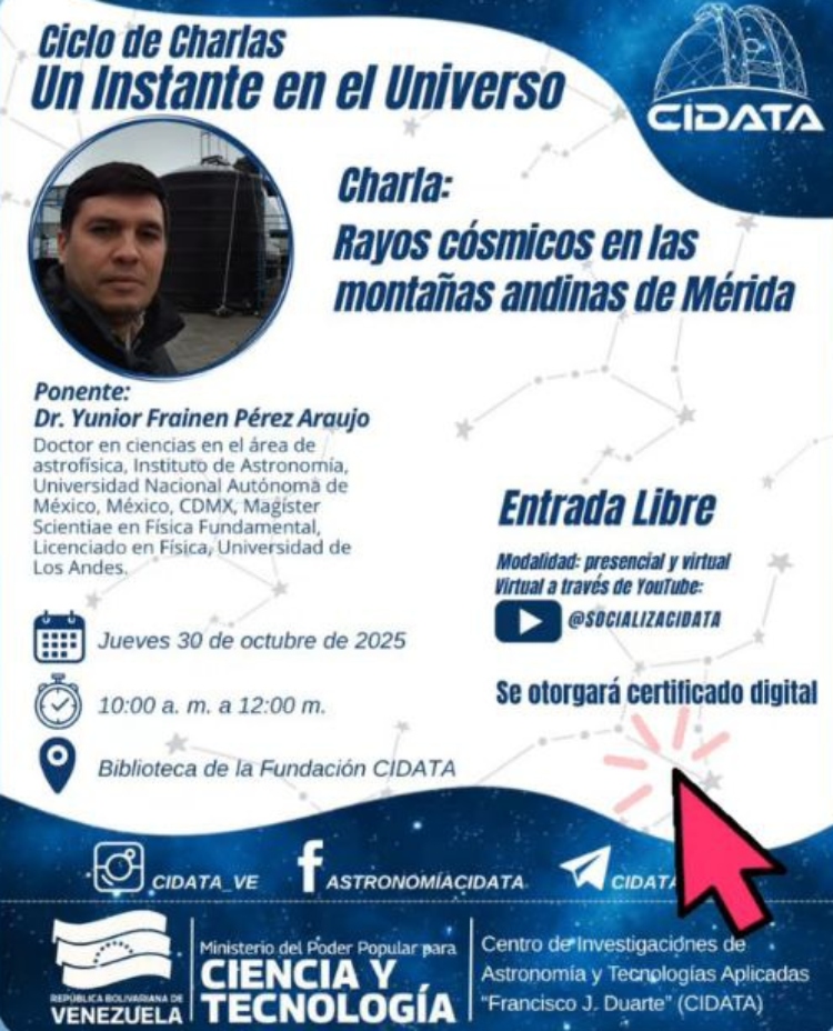 (Caracas, 27 de octubre de 2025). – La Fundación Centro de Investigaciones de Astronomía y Tecnologías Aplicadas (Cidata), ente adscrito al Ministerio del Poder Popular para Ciencia y Tecnología (Mincyt), invita a la charla Rayos cósmicos en las montañas andinas de Mérida, como parte del programa Un Instante en el Universo.