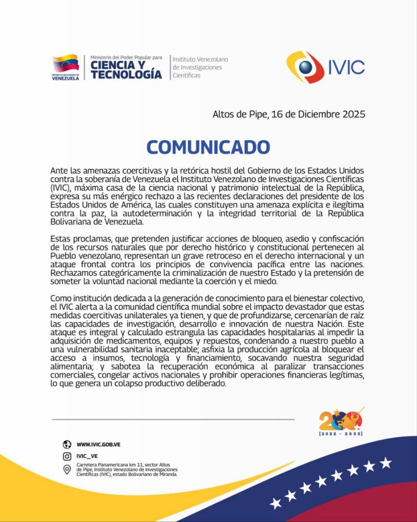 (Caracas, 18 de diciembre de 2025).- La comunidad científica del Instituto Venezolano de Investigaciones Científicas (IVIC) expresó su rechazo a las amenazas y la retórica hostil del Gobierno de Estados Unidos (EE.UU.) hacia la soberanía de Venezuela.