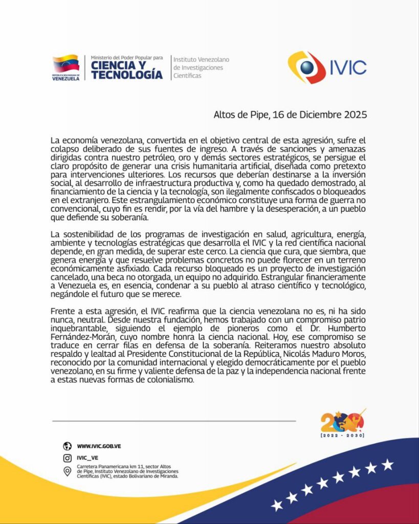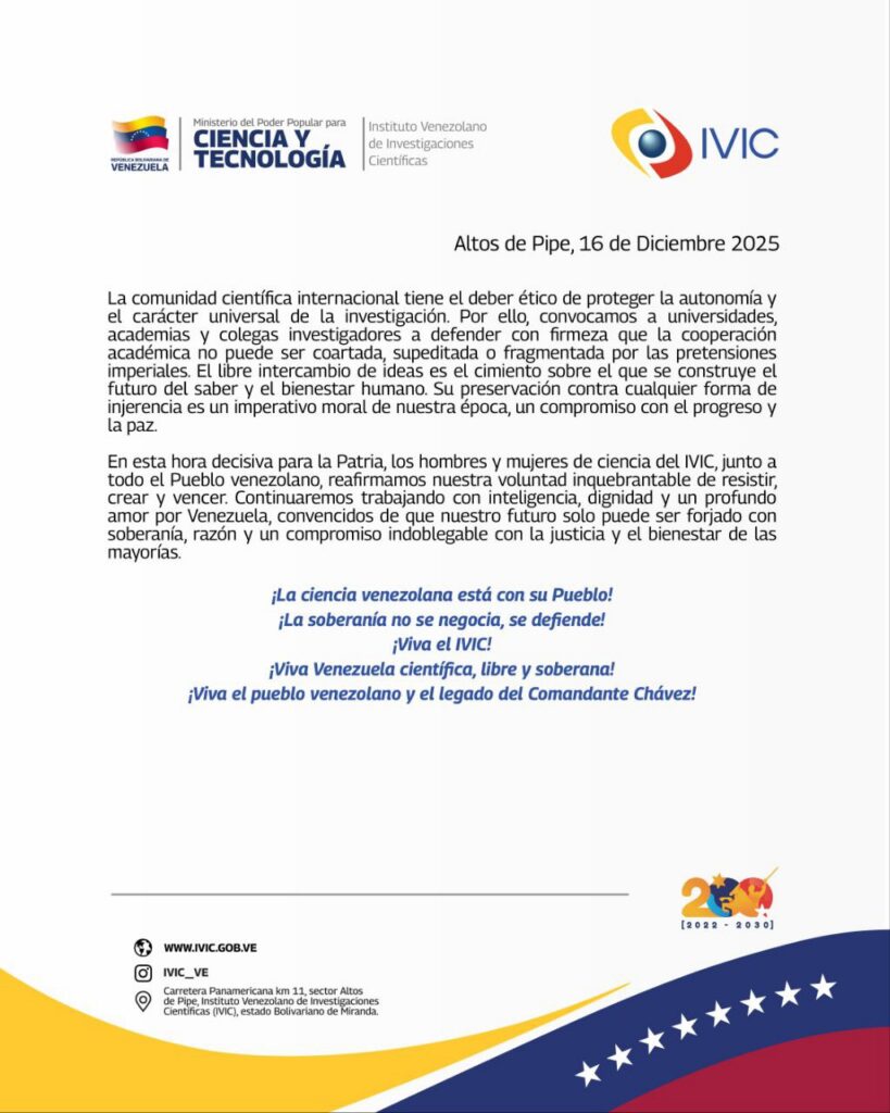 «Como institución dedicada a la generación de conocimiento para el bienestar colectivo, el IVIC alerta a la comunidad científica mundial sobre el impacto devastador que estas medidas coercitivas unilaterales ya tienen, y que de profundizarse, cercenarían de raíz las capacidades de investigación, desarrollo e innovación de nuestra Nación», señala el texto, compartido por la ministra del Poder Popular para Ciencia y Tecnología, Gabriela Jiménez Ramírez.