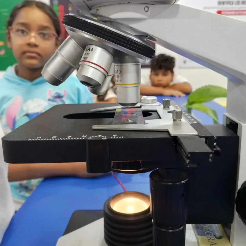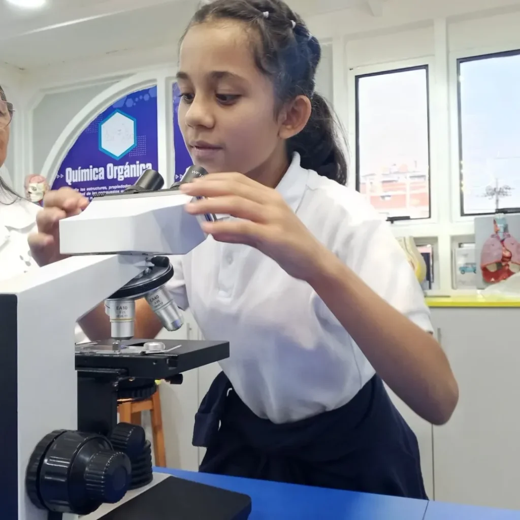 En la jornada, los pequeños científicos aprendieron el manejo técnico del microscopio, identificando componentes esenciales como el revólver, los lentes objetivos de diversos aumentos (4x, 10x y 40x) y el lente ocular.