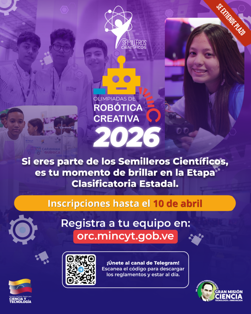 (Caracas, 28 de marzo de 2026).- La ministra del Poder Popular para Ciencia y Tecnología, Gabriela Jiménez Ramírez, informó hoy la extensión del periodo de inscripciones para las Olimpiadas de Robótica Creativa 2026 hasta el próximo 10 de abril.