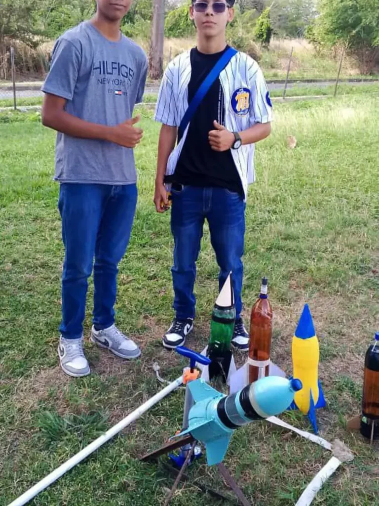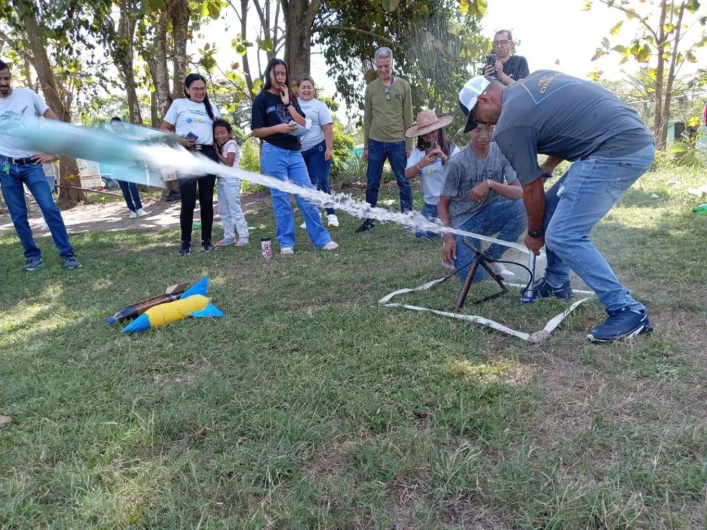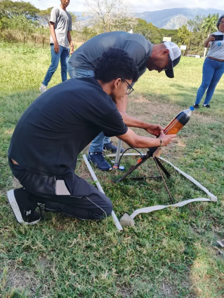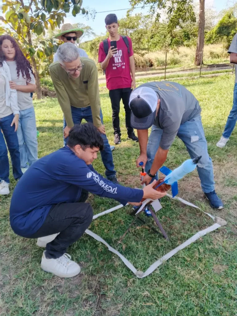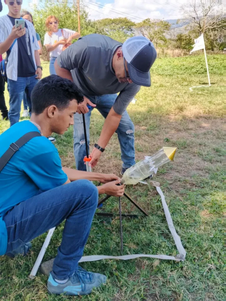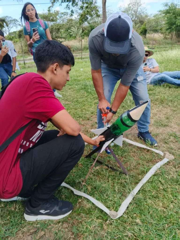 Esta experiencia formativa se centró en la construcción y lanzamiento de cohetes elaborados con materiales reciclados, promoviendo el aprendizaje práctico y el trabajo en equipo.