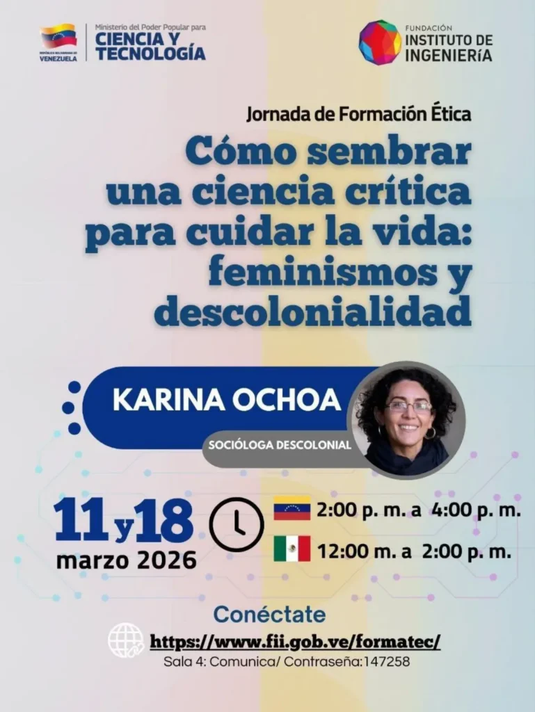 (Caracas 11 de marzo de 2026).- La Fundación Instituto de Ingeniería para Investigación y Desarrollo Tecnológico (FIIIDT), ente adscrito al Ministerio del Poder Popular para Ciencia y Tecnología (Mincyt), convoca a la comunidad científica y al público general a participar en la Jornada de Formación Ética titulada: «Cómo sembrar una ciencia crítica para cuidar la vida: feminismos y descolonialidad».