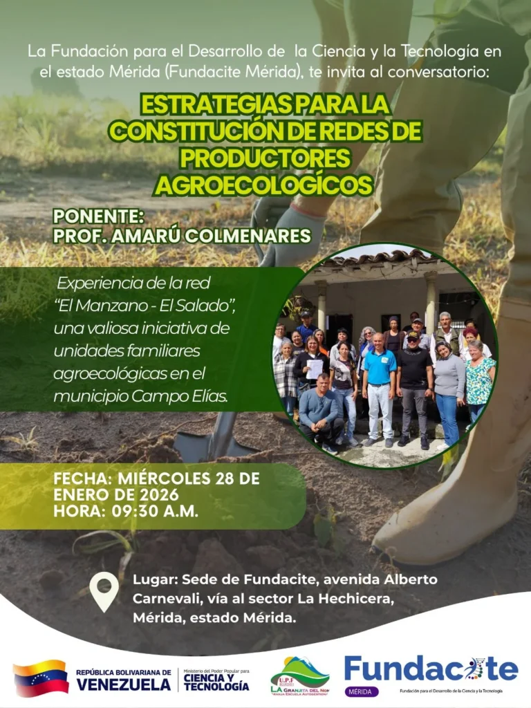 (Caracas, 26 de enero de 2026).- La Fundación para el Desarrollo de la Ciencia y la Tecnología (Fundacite) en el estado Mérida, invita al conversatorio Estrategias para la constitución de redes de productores agroecológicos, que se realizará este miércoles 28 de enero a partir de las 9:30 de la mañana.