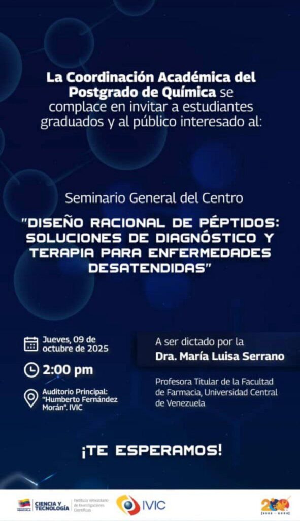 (Caracas, 8 de octubre de 2025). – La coordinación académica del Postgrado de Química del Instituto Venezolano de Investigaciones Científicas (IVIC), adscrita al Ministerio del Poder Popular para Ciencia y Tecnología (Mincyt), invita a la comunidad científica a participar en el Seminario General del Centro Diseño Racional de Péptidos: Soluciones de Diagnóstico y Terapia para Enfermedades Desatendidas.