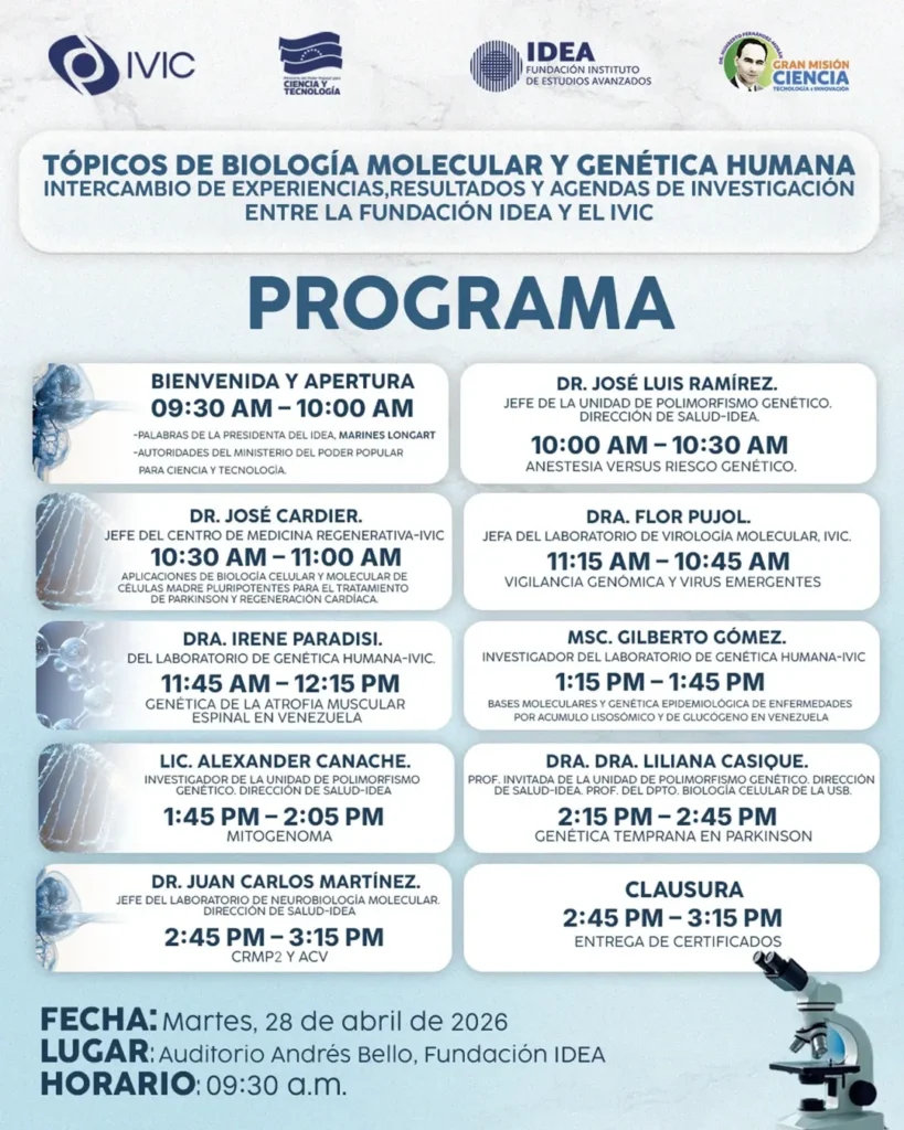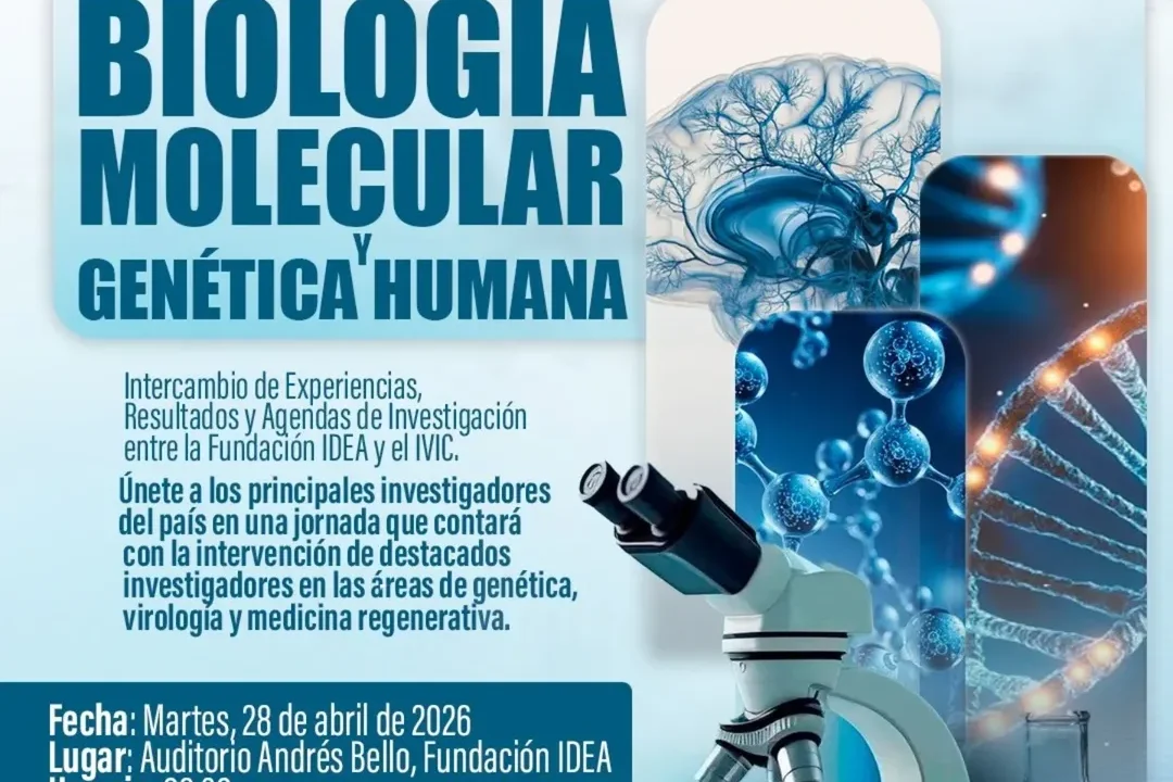 (Caracas, 25 de abril de 2026).- Con el firme propósito de fortalecer la soberanía científica nacional, el Ministerio del Poder Popular para Ciencia y Tecnología (MinCyT) invita a la comunidad científica, académica y estudiantil a la jornada «Tópicos de Biología Molecular y Genética Humana», a realizarse el martes 28 de abril de 2026, desde las 09:30 a. m., en las instalaciones del Auditorio Andrés Bello de la Fundación Instituto de Estudios Avanzados (IDEA).