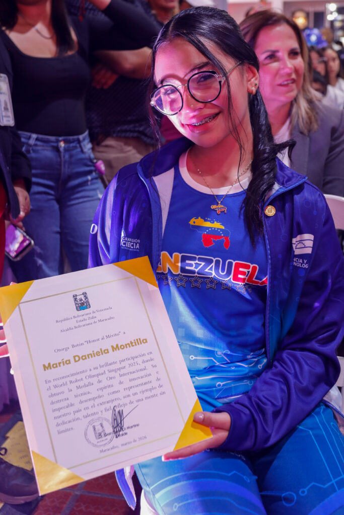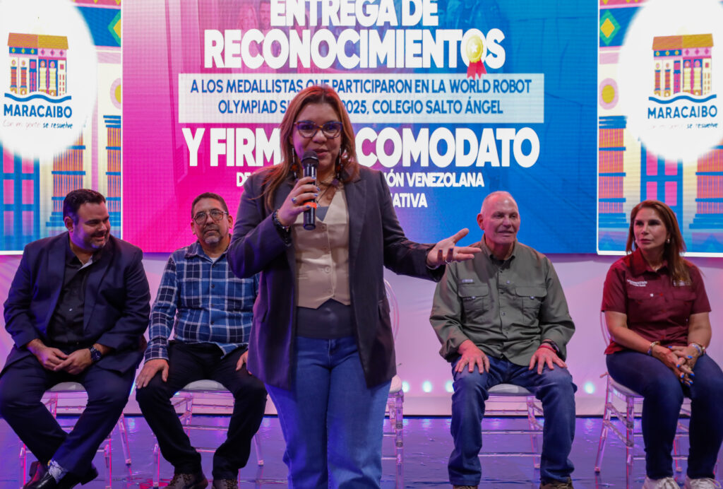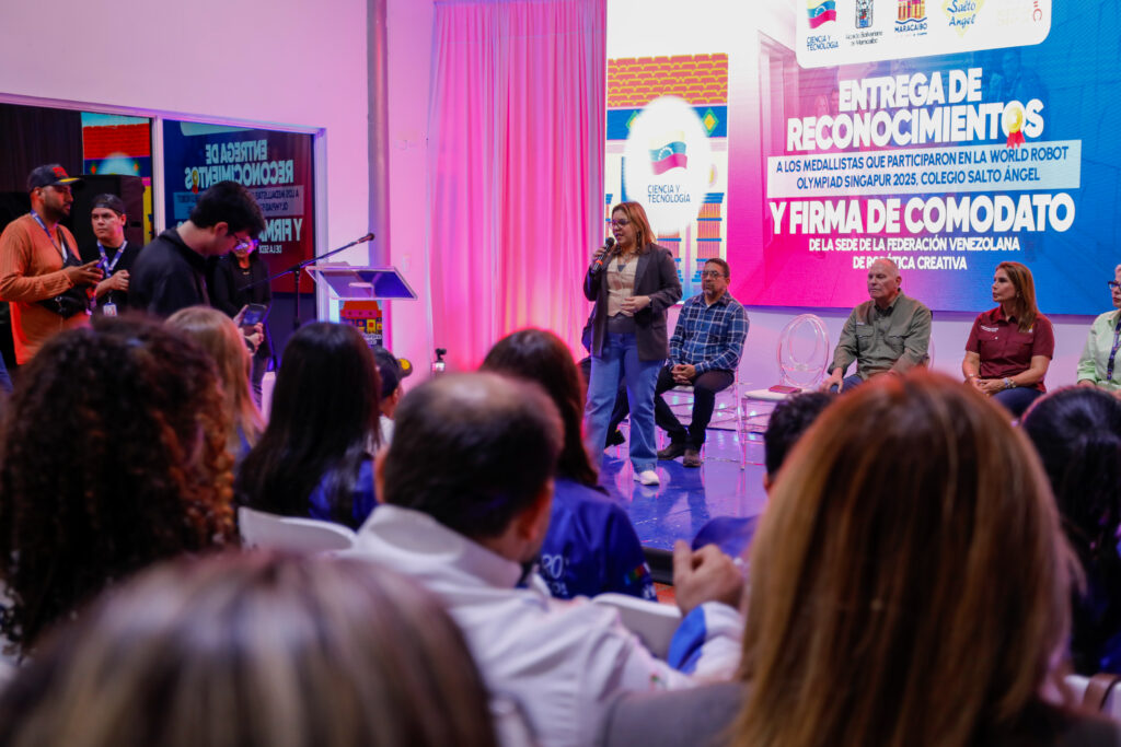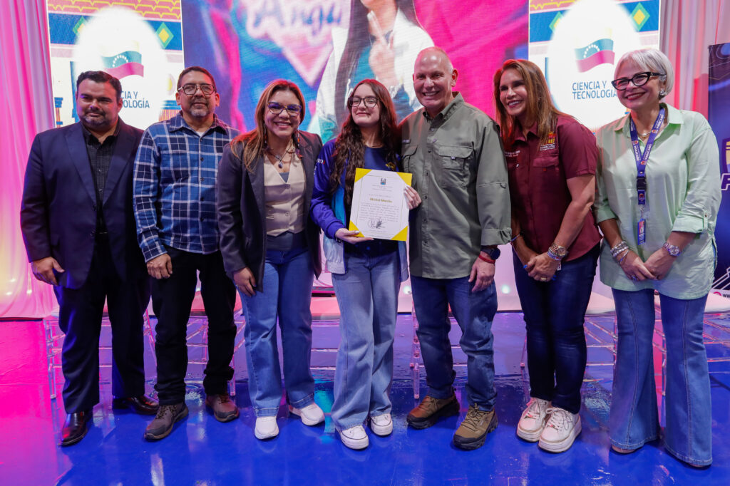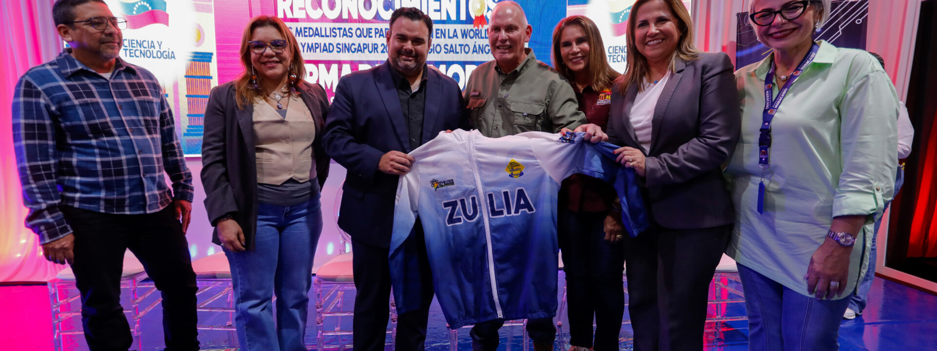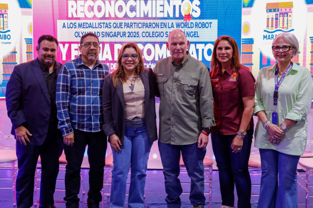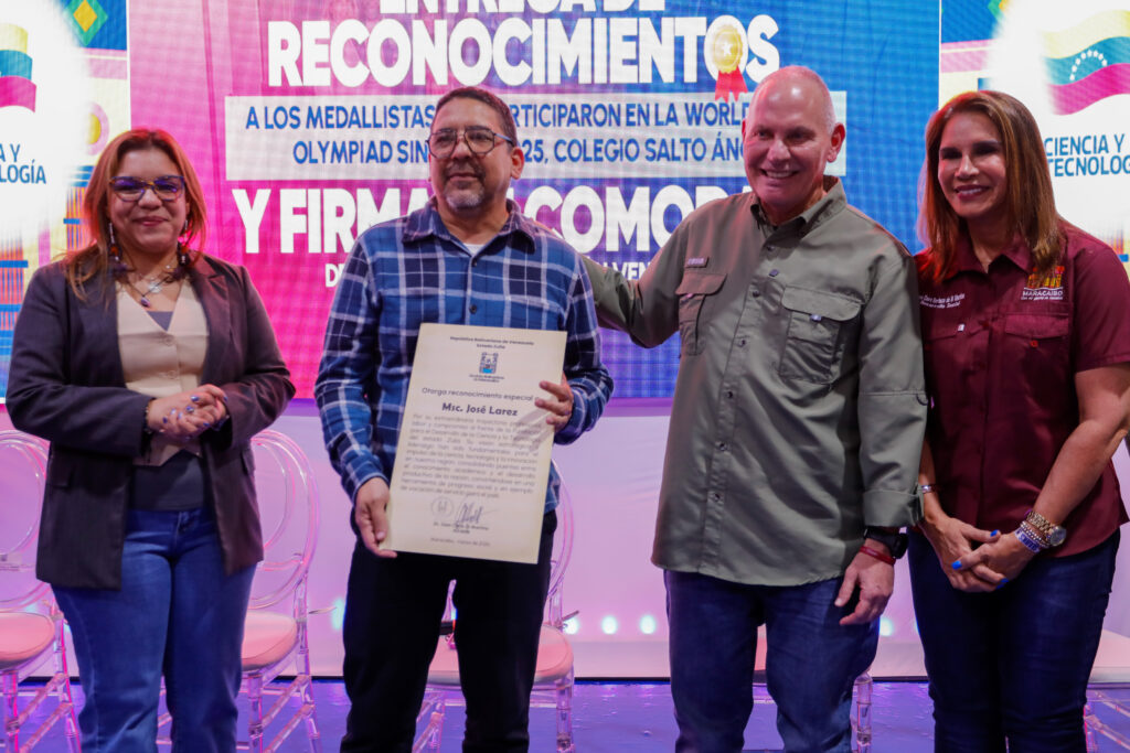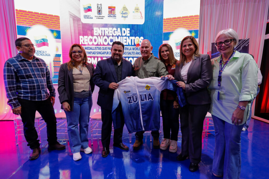 Durante el evento, la viceministra Danmarys Hernández y el alcalde de Maracaibo, Giancarlo Di Martino, honraron el esfuerzo de los integrantes del Programa Nacional Semilleros Científicos y estudiantes del Colegio Salto Ángel que resultaron campeones en las olimpiadas de Singapur 2025, reafirmando que en Maracaibo sobra talento científico.