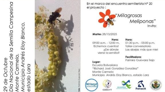 (Caracas, 27 de octubre de 2025).-Como parte de la conmemoración del Día Nacional de la Semilla Campesina, que se celebra cada 29 de octubre, el Ministerio del Poder Popular para Ciencia y Tecnología (Mincyt) invita a participar en dos jornadas formativas en el estado Lara como parte del proyecto Milagrosas Meliponas.