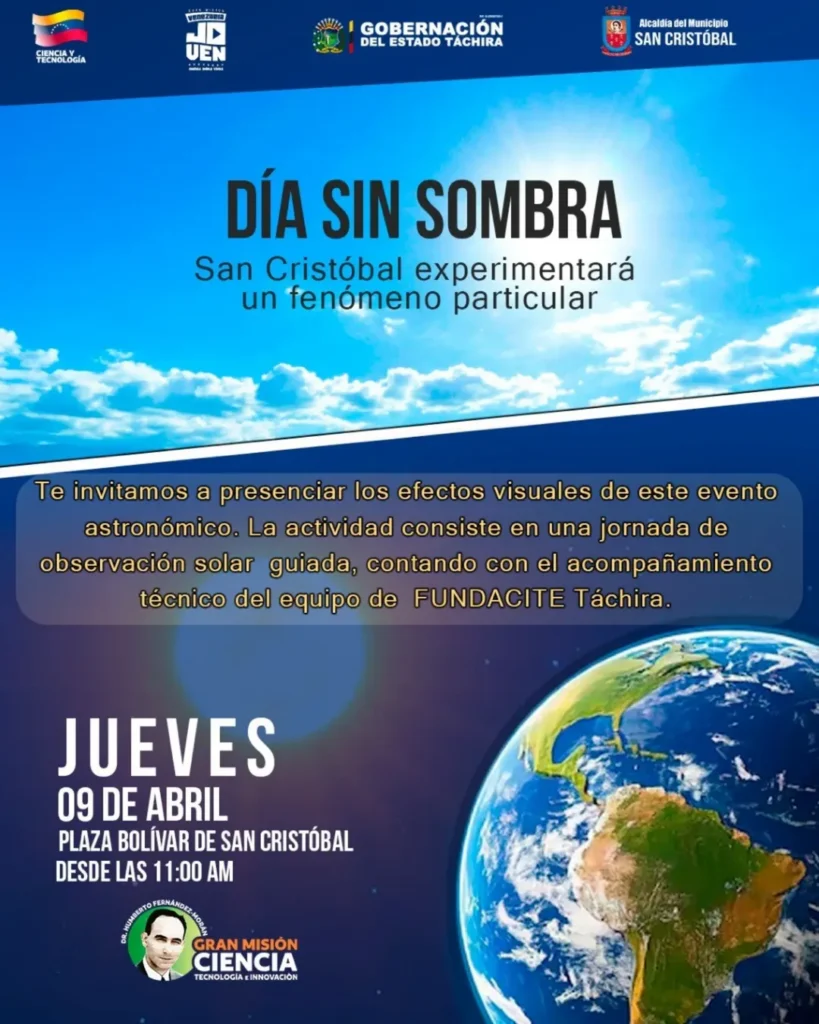 La Fundación para el Desarrollo de la Ciencia y la Tecnología (Fundacite Táchira) ha organizado una jornada especial en la plaza Bolívar, que iniciará a partir de las 11:00 a.m. El momento cumbre del evento, donde el sol alcanzará su punto máximo de verticalidad, ocurrirá exactamente a las 12:50 p.m.