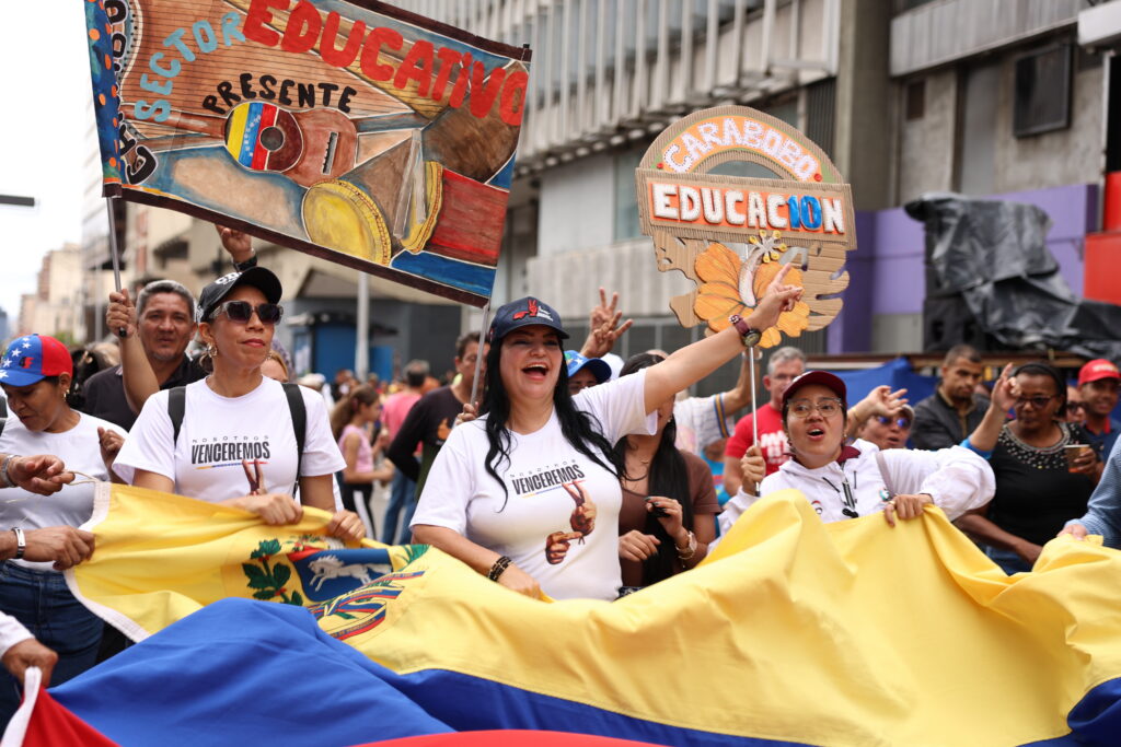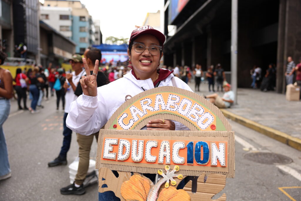 A propósito del Día del Maestro, la docente Neyda Guerra del estado Carabobo, también alzo su voz desde las calles de la capital en rechazo a cualquier agresión que atente contra la paz de todos y todas, exigiendo la liberación del presidente Nicolás Maduro, y de la primera dama, Cilia Flores.