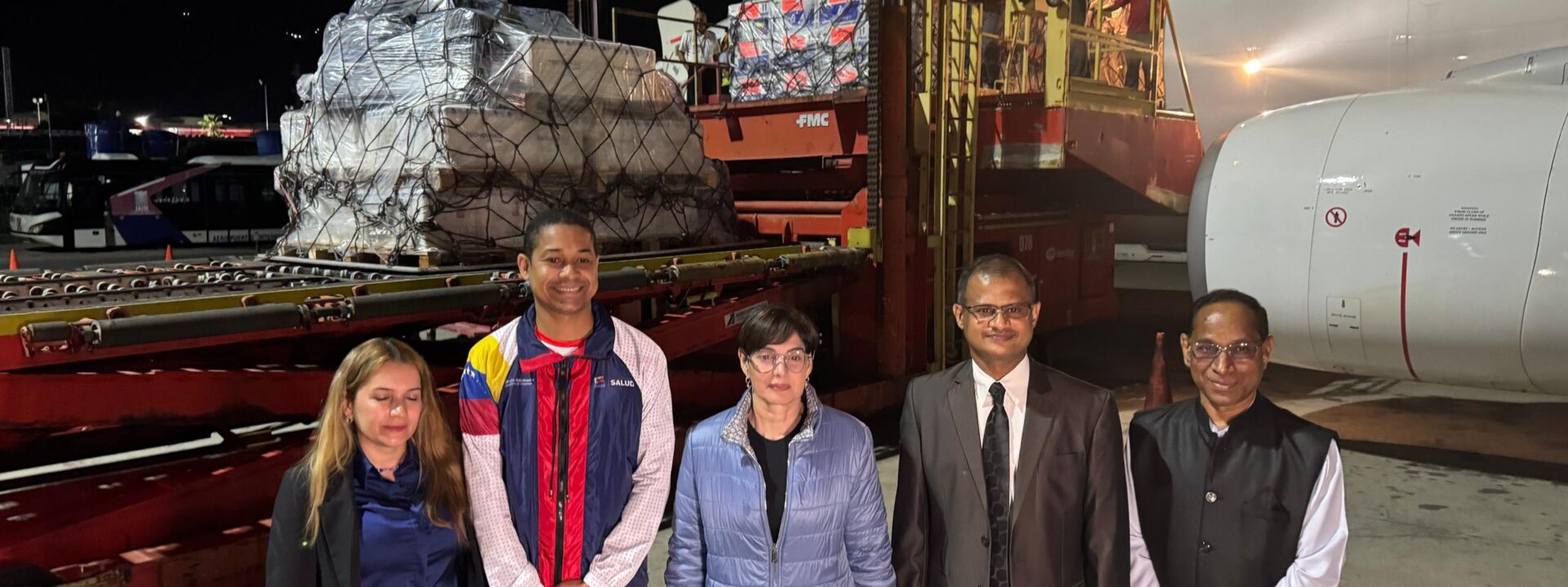 La información la dio a conocer la vicepresidenta Sectorial de Ciencia, Tecnología, Ecosocialismo y Salud, Gabriela Jiménez Ramírez, encargada de recibir el cargamento, junto al Excelentísimo Embajador de la India en Venezuela, Sr. PK Ashok Babu, y el viceministro de Hospitales del Ministerio del Poder Popular para la Salud, Jesús Osteicoechea, en el Aeropuerto Internacional de Maiquetía.